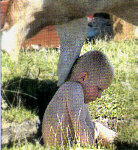 geht lässig mit nacktem Oberkörper durchs Lager. Rote